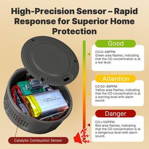 - ?Detector de CO multifuncional 3 em 1?Os detectores portáteis de monóxido de carbono MOES não são apenas capazes de detectar níveis de CO, mas também temperatura e umidade. Com um sensor de taxa de atualização de 2s, podemos determinar rapidamente o valor de CO circundante e a qualidade geral do ar, sabendo em tempo real que o ambiente é seguro ou não. Níveis de CO, dados de temperatura e umidade são exibidos claramente em uma tela HD colorida.