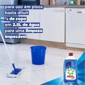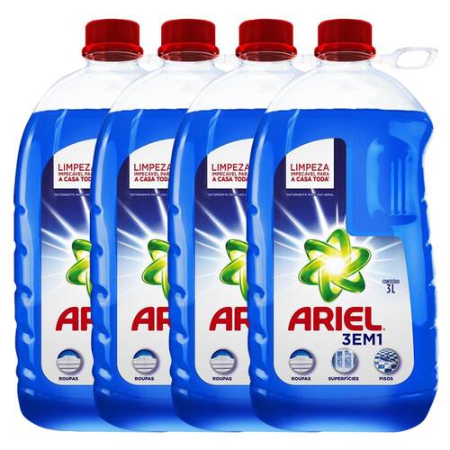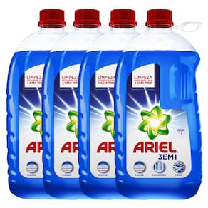 A limpeza da casa toda poderá ser feita com o uso do detergente líquido Ariel. Com 50ml do produto diluído em 2.5 litros de água, você limpa pisos e superfícies. Já as roupas são limpas com 100ml no dispenser da lavadora. O kit é formado por 4 unidades de 3 litros em cada frasco.