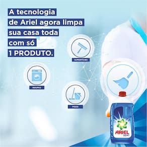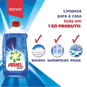 Limpe a casa toda com um só produto ao adquirir o Detergente Líquido Ariel Multiuso 3 em 1 com 3 litros. Com ele, é possível higienizar roupas, pisos e superfícies com a mesma eficiência. Sua exclusiva tecnologia limpa profundamente, sem deixar resíduos e proporcionando um cheiro de limpeza em tudo.