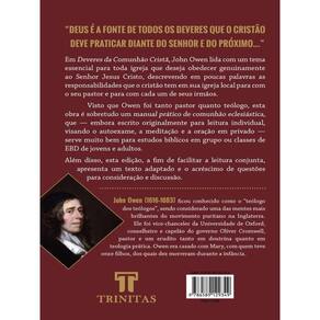 “Deus é a fonte de todos os deveres que o cristão deve praticar diante do Senhor e do próximo…” Em Deveres da Comunhão Cristã, John Owen lida com um tema essencial para toda igreja que deseja obedecer genuinamente ao Senhor Jesus Cristo, descrevendo em poucas palavras as responsabilidades que o cristão tem em sua igreja local para com o seu pastor e para com cada um de seus irmãos. Visto que Owen foi tanto pastor quanto teólogo, esta obra é sobretudo um manual prático de comunhão eclesiástica, que — embora escrito originalmente para leitura individual, visando o autoexame, a meditação e a oração em privado — serve muito bem para estudos bíblicos em grupo ou classes de EBD de jovens e adultos. Além disso, esta edição, a fim de facilitar a leitura conjunta, apresenta um texto adaptado e o acréscimo de questões para consideração e discussão. Sobre o autor: John Owen (1616 - 1683) foi conhecido como o “teólogo dos teólogos”, sendo considerado uma das mentes mais brilhantes do movimento Puritano na Inglaterra. Ele foi vice-chanceler da Universidade de Oxford, conselheiro e capelão do governo Oliver Cromwell, pastor e um erudito tanto em doutrina quanto em teologia prática. Foi casado com Mary, com quem teve 11 filhos, dos quais 10 morreram durante a infância. Marca: Não Informado