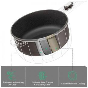Fácil de limpar e saudável para cozinhar, o revestimento antiaderente garante que os alimentos não grudem, facilitando muito a limpeza após o uso. Além disso, essa característica promove uma culinária mais saudável, pois reduz o uso de óleo em comparação a panelas comuns. Segurança e consciência ambiental são prioridades, já que o material é livre de toxinas mesmo em altas temperaturas e é ecologicamente correto.