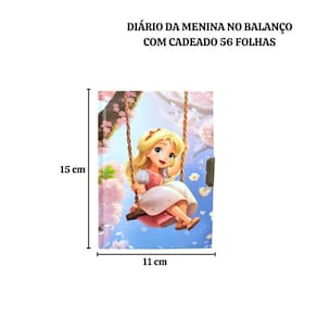 DIÁRIO DA MENINA NO BALANÇO COM CADEADO 56 FOLHAS - SXFS14065 Um diário infantil encantador, adornado com cores vibrantes, projetado especialmente para cativar a imaginação das crianças. Esse diário possui uma capa resistente com personagem encantador. O cadeado não apenas acrescenta um elemento de mistério, mas também incentiva a importância de guardar segredos e sentimentos pessoais. Informações Técnicas:Composição: Papel.Folhas: Listradas / Desenhada.Altura do díario: 15cm.Comprimento: 11cm.Contém: 56 folhas.Peso: 137 gramas.