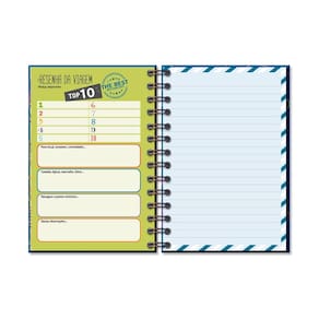 Capa dura, miolo pautado e decorado com 80 folhas em papel offset 90 g (você pode usar canetas coloridas que não passam para o outro lado), formato 11,8 cm × 17,5 cm, encadernação em wire-o.