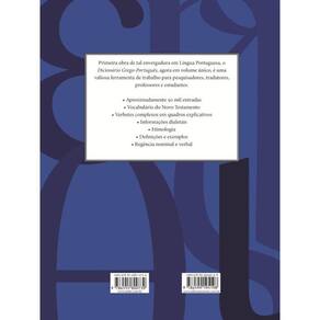 # Dicionário Grego-Português #Retorna essa grande obra, agora em volume único! Primeira obra de tal envergadura em Língua Portuguesa, o Dicionário Grego-Português, agora em volume único, é uma valiosa ferramenta de trabalho para pesquisadores, tradutores, professores e estudantes.Aproximadamente 50 mil entradasVocabulário do Novo TestamentoVerbetes complexos em quadros explicativosInformações dialetaisEtimologiaDefinições e exemplosRegência nominal e verbalCoedição: Editora Mnema