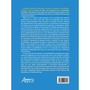 Diferença humana em Educação: inclusão, EJA, gênero, sexualidade e formação docente suscita no leitor um encontro com a promissora realidade: não existe escola onde não haja diferença marcante entre seus alunos. Negar essa realidade faz com que o trabalho docente seja incapaz de florescer. Neste livro, o autor propõe pensar acerca da diferença humana apresentada na escola, mas não como um empecilho para que se avance na aprendizagem. Pelo contrário, a intenção é lançar o desafio de superestimá-la como essência precisa e prestimosa na ampliação da formação cultural, especificamente nos aspectos: humanísticos, solidário e favorável ao combate ao preconceito. Também, apresenta experiências docentes de sucesso, capazes de fazer com que o trabalho em sala de aula _que ainda mais enriquecido, ao passo que se reconheça que a subjetividade dos alunos e a sua demanda pelo reconhecimento da diferença seja suprida no que tange: à aprendizagem da pessoa com deficiência incluída em classe comum; à discussão acerca da sexualidade nas pessoas com deficiência intelectual; à construção de um currículo voltado à demanda de pessoas jovens e adultas no que tange à sexualidade e às questões de gênero, especificamente à homoafetividade; à necessidade de se ampliar o tempo para a aprendizagem de leitura e escrita para os alunos com deficiência intelectual incluídos no ensino médio na modalidade de EJA; e à formação de professores adequada à habilidade para atuar em uma escola em que a diferença seja acolhida. O livro, além de apresentar as possibilidades resultantes da práxis docente realizadas em sala de aula pelo autor, que também é professor, está fundamentado com referenciais e ensaios teóricos norteados por importantes pensadores da área da Educação, como Lev S. Vygotsky e Theodor W. Adorno, intensificando a ideia de que o educador deixa de ser um mero executor de tarefas reestabelecidas por exortações de uma classe governamental e burocratas educacionais, à medida que passa a se reconhecer enquanto senhor de sua práxis, não temendo lidar com a diferença. Mas, para isso, esse profissional necessita estar respaldado pelos referenciais teóricos e pela ciência, tão necessários no mundo de hoje.