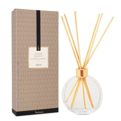 Difusor de Varetas Jasmim Branco 200mL Via Aroma Difusor de Varetas Jasmim Branco 200mL Via Aroma Transforme seu ambiente com a elegância e o perfume suave do Jasmim Branco, proporcionando uma atmosfera de bem-estar e tranquilidade.O Difusor de Varetas Jasmim Branco 200mL Via Aroma é a escolha perfeita para quem busca uma aromatização constante e um toque de sofisticação na decoração. Com uma fragrância floral marcante e delicada, o jasmim é conhecido por suas notas doces que evocam sensualidade e suavidade. Através das varetas de madeira, o aroma se espalha de forma eficaz, preenchendo o espaço com um perfume leve e duradouro. Ideal para qualquer cômodo da casa ou escritório, este difusor não só perfuma, mas também complementa seu ambiente com seu design clássico. Diferenciais: Aroma constante e envolvente que se mantém no ar, ideal para relaxamento e bem-estar.Produto da Via Aroma, sinônimo de qualidade e excelência em aromatização de ambientes.Além de perfumar, o difusor serve como um belo objeto de decoração, adicionando charme ao seu espaço. Mais sobre o Produto: A fragrância Jasmim Branco Via Aroma possui uma rica composição, com notas de topo especiadas e um toque de lima, um coração floral intenso de jasmim e um fundo amadeirado com musk, criando uma experiência olfativa complexa e agradável.O jasmim é uma flor de origem indiana, associada ao poder feminino e à delicadeza, o que confere à fragrância um caráter único e inspirador.Com 200mL, garante uma longa duração, mantendo seu ambiente sempre perfumado com praticidade. Dicas de Uso: Para utilizar, basta abrir a tampa, remover o lacre plástico e inserir as varetas de madeira no frasco. Para garantir a intensidade constante do aroma, vire as varetas uma vez ao dia.Recomendamos o uso em locais fechados para uma melhor performance da difusão do aroma.Conservação: Mantenha o produto em temperatura ambiente e protegido da luz para preservar suas características.Advertências: Manter fora do alcance de crianças e animais domésticos. Uso externo. Não ingerir. Evite contato prolongado com a pele. Cuidado, inflamável Deixe longe do fogo e superfícies aquecidas. Em contato com a luz, pode haver alteração de cor. Marca: Não Informado