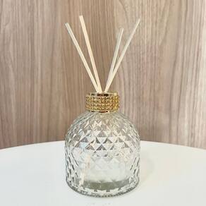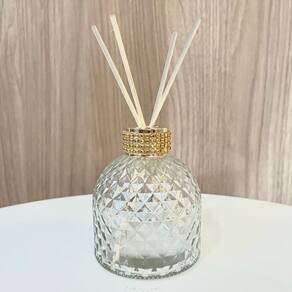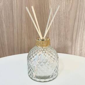 Decoração sala quarto difusor de vidro dourado/ transparente trabalhado com varetas e detalhe pedrarias.
