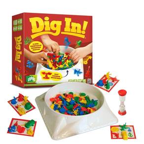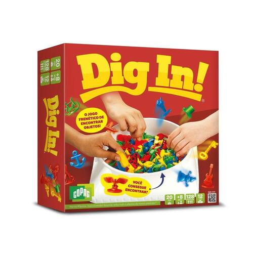 Com uma dinâmica acelerada, cada jogador tem apenas 15 segundos para identificar os objetos sozinho, e depois todos devem buscar em conjunto. Com 129 miniaturas coloridas, 1 ampulheta, 1 recipiente para misturar as figuras e 12 cartas com imagens desafiadoras, o Dig In proporciona horas de diversão para crianças acima de 8 anos.