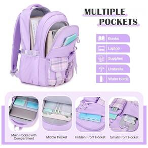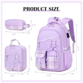 Conjunto escolar 3 em 1 composto por mochila, lancheira e estojo, com detalhes em xadrez e laço, indicado para meninas do ensino fundamental, médio e início de faculdade. A mochila principal oferece espaço para cadernos, livros, fichário, estojo, tablet e notebook, com bolsos internos e externos que facilitam a organização de materiais escolares e itens pessoais no dia a dia.