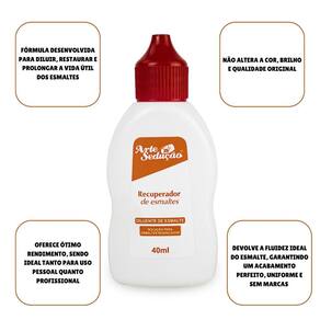 Contém: 01 - Recuperador de Esmaltes Ressecados 40ml, Arte Sedução O Recuperador de Esmaltes da Arte Sedução é o aliado ideal para quem quer dar vida nova aos esmaltes ressecados, grossos ou de difícil aplicação. Sua fórmula foi desenvolvida especialmente para diluir, restaurar e prolongar a vida útil dos esmaltes, sem alterar a cor, brilho ou qualidade. Prático e fácil de usar, ele devolve a fluidez ideal ao esmalte, garantindo acabamento perfeito, uniforme e sem marcas. Na embalagem de 40ml, ele oferece ótimo rendimento, sendo perfeito tanto para uso pessoal quanto . Características Principais: - 40ml; - Recupera esmaltes grossos e ressecados; - Fórmula que dilui, restaura e prolonga a vida útil dos esmaltes; - Prático e fácil de usar; - Devolve a fluidez ideal ao esmalte; - Garante acabamento perfeito, uniforme e sem marcas; - Ótimo rendimento; - Ideal para uso pessoal e . Boas Compras ; Marca: Não Informado