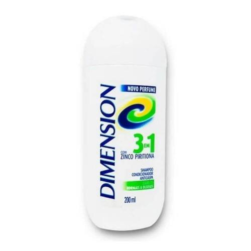 Dimension Anticaspa 3x1 Shampoo 200ml DESCRIÇÃO:Com o Shampoo Anticaspa 3 em 1 Dimension para Cabelos Oleosos você limpa seus cabelos e os condiciona de forma adequada. Imagem meramente ilustrativa. O produto pode ter variação de cor ou desenho, porém as características gerais são as mesmas especificadas na descrição do produto.AÇÃO/ATIVOS:Ele possui fórmula com sais minerais, ingredientes adstringentes que equilibram a oleosidade do couro cabeludo, evitando que eles voltem a ficar oleosos rapidamente.MODO DE USAR:Dispensa o uso de outros produtos após o shampoo.ESTE KIT CONTÉM: 01 UNIDADE DE DIMENSION ANTICASPA 3X1 SHAMPOO 200MLDimension Anticaspa 3x1 Shampoo 200ml