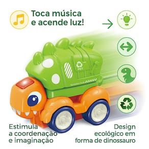 Destaques e Benefícios: • Movimento rápido com container ecológico balançante • Sons divertidos, incluindo efeitos de dinossauro • Luzes piscantes para estimular a atenção • Acionamento simples por botão – ideal para os pequenos • Design lúdico com tema de reciclagem e preservação • Estimula o aprendizado, a imaginação e a coordenação