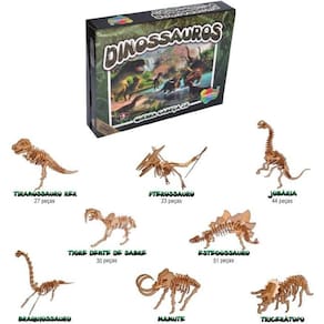 Especificações Técnicas Marca: Aquarela Brinquedos Modelo: Quebra Cabeça 3D Dinossauros, em 8 modelos diferentes : - Tiranossauro Rex com 27 peças, Pterossauro com 23 peças, Estegossauro com 51 peças, Tricerátopo com 17 peças, Braquiossauro com 38 peças, Mamute com 19 peças, Jobária com 44 peças e Tigre Dente de Sabre com 30 peças. Material: Madeira mdf INMETRO: 003642/2022 Idade Mínima Recomendada: 3 anos Idade Máxima Recomendada: 99 anos Medidas: Cada uma das 8 embalagens mede 24 x 18 x 4 cm. É sugerido uso de cola branca para fixação das peças após montagem, e indicado acompanhamento de um adulto para auxiliar crianças pequenas nas montagens. Marca: Aquarela Brinquedos