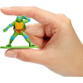 - Cenário: 27,0 C x 23,0 L x 30,0 A cm aproximadamente - 4 figuras Tartarugas Ninjas em metal medindo aproximadamente 3,5 centímetros cada - 1 carrinho miniatura party wagon em PVC medindo 10,0 C x 4,5 L x 5,0 A centímetros aproximadamente e mais acessórios.
