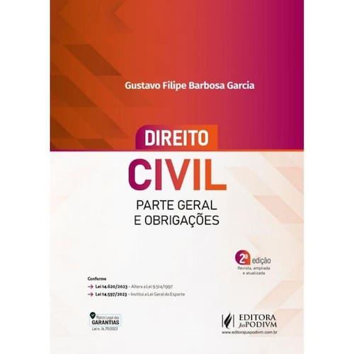 CONFORME: • Lei 14.620/2023 – Altera a Lei 9.514/1997 • Lei 14.597/2023 – Institui a Lei Geral do Esporte POR QUE ESCOLHER A OBRA “DIREITO CIVIL - PARTE GERAL E OBRIGAÇÕES”? Esta obra tem como objetivo a análise didática e atualizada da Parte Geral do Direito Civil e das Obrigações. Procura-se relacionar os institutos gerais do Direito Civil e do Direito das Obrigações com certos aspectos mais específicos, para a compreensão global e mais adequada da disciplina. Este livro foi escrito com o especial enfoque de proporcionar um estudo diferenciado e abrangente da referida disciplina, em conformidade com a evolução doutrinária, jurisprudencial e legislativa a respeito dos seus diversos temas. Espera-se, assim, que a presente obra possa receber a mesma acolhida das anteriores. Gustavo Filipe Barbosa Garcia Marca: JUSPODIVM **