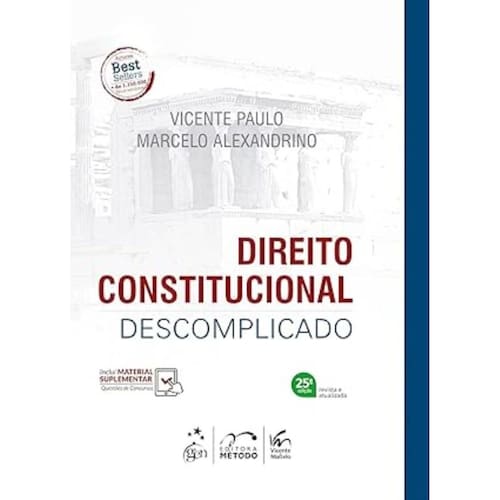 Os Professores Vicente Paulo e Marcelo Alexandrino têm, como relevante diferencial, a singular capacidade de transportar para a escrita a mesma didática que os caracteriza nas salas de aulas, pela qual conseguem tratar de temas altamente complexos de forma objetiva e cristalina, em linguagem descomplicada e amplamente acessível. A maestria na comunicação, a clareza na abordagem dos assuntos, a empatia com seu público e a sua preparação podem explicar parte do sucesso de aceitação de suas obras. Direito Constitucional Descomplicado é reflexo das características apontadas acima. O livro aborda todos os temas relevantes da disciplina, contemplando o conteúdo de editais dos principais concursos públicos e também os programas das universidades do País, tudo com o rigor científico que exige a matéria.