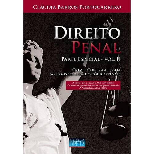 A experiente professora Cláudia Portocarrero, Promotora de Justiça do Estado do Rio de Janeiro, aborda no seu livro Direito Penal - Parte Especial, volume II, os crimes contra a pessoa, trabalhando do art. 121 ao 154 do Código Penal brasileiro. A obra integra a Coleção "Síntese Jurídica", que traz para o leitor textos sobre os mais relevantes temas jurídicos, nos mais diferentes ramos do Direito. Dessa forma, direciona os iniciantes no estudo dessa ciência e municia os operadores do Direito com sustentação e solidez de seus conhecimentos. Neste volume, com a clareza e a profundidade que lhe são peculiares, Cláudia Portocarrero trata de pontos fundamentais, como crimes contra a vida, lesão corporal e crimes contra a honra e contra a liberdade individual. A autora também disponibiliza 100 questões de concursos com os respectivos gabaritos comentados para que os leitores testem e apliquem o conhecimento assimilado. O tema, como toda matéria em constante evolução, além de atual, é abordado de forma técnica e clara, trazendo ao leitor o complemento jurídico pertinente à consolidação de seus conhecimentos. Pontos principais da obra:- Indicado para concurseiros, exame da OAB e universitários- Contém 100 questões de concursos com gabarito comentado- Um resumo ideal para o aprendizado dos mais relevantes temas jurídicos.