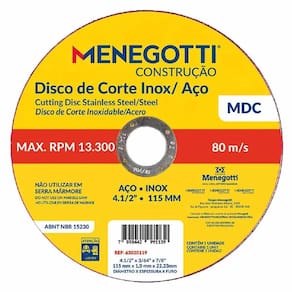 O Disco de Corte Inox / Aço 115mm Com 10 Unidades MDC 63030119 - Menegotti, é a escolha ideal para cortes precisos e eficientes em metais. Indicado especialmente para cortar aços e suas ligas, incluindo aço inoxidável, este disco oferece alta performance, durabilidade e segurança durante o uso. Projetado para e industrial, o produto garante excelente rendimento em aplicações que exigem resistência e acabamento de qualidade. Com 115 mm de diâmetro, é compatível com esmerilhadeiras angulares e proporciona cortes rápidos, limpos e com menor geração de rebarbas. Características: Ideal para operações de corte que necessitam de excelente acabamento corte fino . Proporciona cortes rápidos e menos rebarba. Não utilizar em serra mármore. Uso exclusivo em esmerilhadeiras de 4.5'' , 7'' , 9''. Elaborado com duas telas de fibra de vidro para maior segurança. Uso semiprofissional, e industrial. Descrição do Produto: Medida mm x pol : 115mm - 4.5. Espessura. Do Disco Pol : 1,0mm - 3/64. Rotação Rpm : 13.300. Contém 10 Unidades na Embalagem. Referência: 63030119. Cód. De Fábrica: 63030119. Marca: Menegotti. Marca: Não Informado Ean: 1000011073474