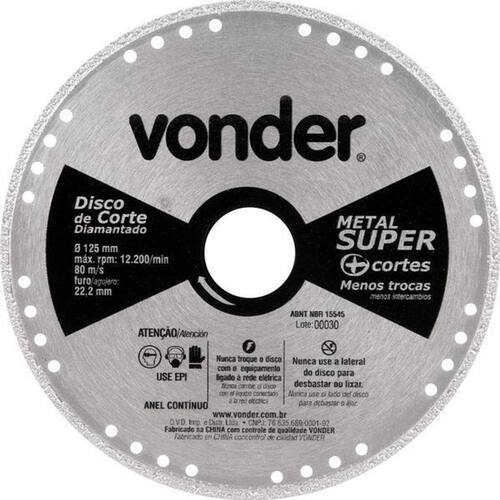 Marca:vonderconteúdo da embalagem:1 disco de corte diamantadodescrição:disco de corte diamantado, contínuo, para metais, metal super, 125 mm, vonderindicações:indicado para serralheiros e demais profissionais em geral. Ideal para cortar barras, tubos, chapas metálicas, aço carbono e aço inox. Utilizado em esmerilhadeiras.Características técnicas:categoria do multímetro: cat iii 600v diâmetro do furo do disco de corte diamantado: 22,2 mm tipo de corte do disco de corte diamantado: a seco perfil do corte: anel contínuo rotação máxima rpm : 12200 /mincodigo do forncedor:1240000125 Marca: Não Informado Ean: 7893946600679
