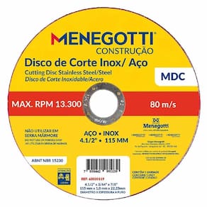 O Disco de Corte Inox / Aço 115mm Com 50 Unidades MDC 63030119 - Menegotti, é a escolha ideal para cortes precisos e eficientes em metais. Indicado especialmente para cortar aços e suas ligas, incluindo aço inoxidável, este disco oferece alta performance, durabilidade e segurança durante o uso. Projetado para e industrial, o produto garante excelente rendimento em aplicações que exigem resistência e acabamento de qualidade. Com 115 mm de diâmetro, é compatível com esmerilhadeiras angulares e proporciona cortes rápidos, limpos e com menor geração de rebarbas. Características: Ideal para operações de corte que necessitam de excelente acabamento corte fino . Proporciona cortes rápidos e menos rebarba. Não utilizar em serra mármore. Uso exclusivo em esmerilhadeiras de 4.5'' , 7'' , 9''. Elaborado com duas telas de fibra de vidro para maior segurança. Uso semiprofissional, e industrial. Descrição do Produto: Medida mm x pol : 115mm - 4.5. Espessura. Do Disco Pol : 1,0mm - 3/64. Rotação Rpm : 13.300. Contém 50 Unidades na Embalagem. Referência: 63030119. Cód. De Fábrica: 63030119. Marca: Menegotti. Marca: Não Informado
