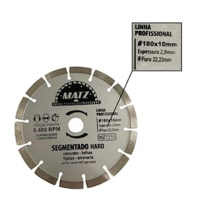 Informações técnicas: Perfil do corte: Segmentado Diamantado Tipo de corte: A seco e refrigerado Dimensões: - Diâmetro externo: 180mm 7.1/4'' - Diâmetro do furo: 22,23mm 7/8'' - Acompanha anel de redução para 20mm - Perfil de corte: 10mm - Espessura: 2mm Rotação máxima por minuto RPM : 8.400 - 80m/s Para corte de: Concreto, telha, tijolo e alvenaria Proporciona qualidade e produtividade na operação Produto de altíssima qualidade com alta performance