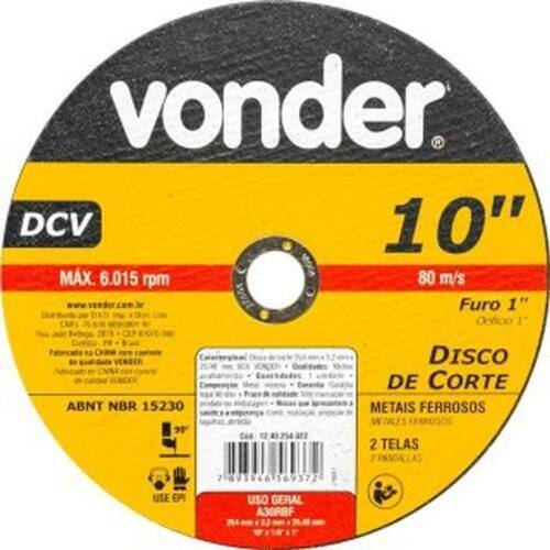 Disco Corte Ferro Vonder Div. 254x3.2x25.4 10X1/8X1 Caracteristica do Produto: Indicado para serralheiros e demais profissionais em geral. Ideal para cortar aços e materiais ferrosos barras, tubos e chapas , manutenções e reparos leves Possui excelente performance em trabalhos intermitentes.