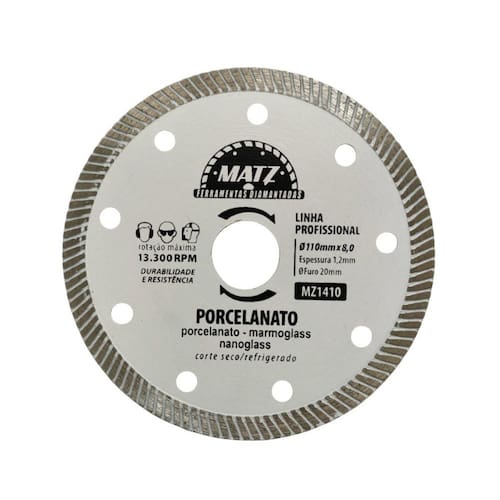 Disco de corte turbo diamantado para porcelanato, ideal para cortes precisos a seco e refrigerado. Seu design turbo garante cortes rápidos e sem lascas, oferecendo alta durabilidade e acabamento impecável. Perfeito para aplicações em porcelanato, combinando praticidade e desempenho em diferentes ferramentas. Informações técnicas: Perfil do corte: Turbo Diamantado Tipo de corte: A seco e refrigerado Dimensões: - Diâmetro externo: 110mm 4.3/8'' - Diâmetro do furo: 20mm - Perfil de corte: 8mm - Espessura: 1,2mm Rotação máxima por minuto RPM : 13.300 - 80m/s Para corte de: Porcelanato, marmoglass e nanoglass Proporciona qualidade e produtividade na operação Produto de altíssima qualidade com alta performance Marca: Não Informado Ean: 7898659064770