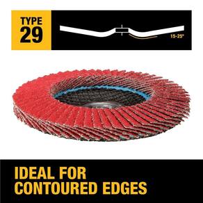 Disco de aba de cerâmica DEWALT DWA8280H 40G T29 XP, 4-1/2" x 5/8" - Tecido de cerâmica XP Premium para longa vida útil e rápida remoção de material - 50% mais rápido que os discos de aba padrão - Oferece vida útil 2,5 vezes maior do que o disco de aba padrão - Permite a capacidade de triturar materiais planos com o acabamento de um disco de fibra