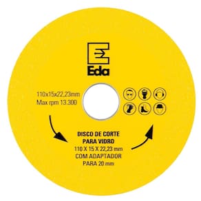 Disco de Corte 110mm para Vidro Cerâmica Porcelanato Eda Profissional - Marca: Eda Profissional - Referência: 0TT - Diâmetro: 110mm - Espessura da camada diamantada: 15mm - Espessura: 1mm - Furo: 22,23mm - Acompanha adaptador para furo de 20mm - Velocidade máxima: 13.300rpm - para corte suave, chanfradura e polimento de vidro, espelho, jade, cristal, garrafas de vidro, cerâmica, azulejos cerâmicos e outros materiais - Não corta vidro temperado - Materiais de alta qualidade, feito de partículas abrasivas de diamante muito finas e uniformes - Lâmina com excelente desempenho de corte e baixo ruído de moagem - Menos poeira, menos detritos, mais conveniente, vida útil mais segura e mais longa. - Corte rápido e preciso. - A lâmina de corte de diamante é resistente a alta temperatura, o que pode reduzir a vibração e cortar mais reto e mais rápido - Peso bruto: 100 gramas - : 90 dias Marca: Não Informado Ean: 7895315021238