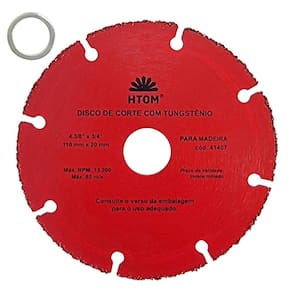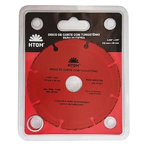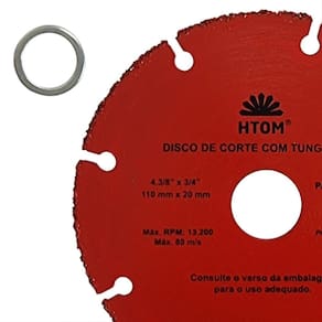 - Marca: HTOM - Referência: HTOM-41407 - Diâmetro: 110mm 4 1/2 - Furo: 20mm - Acompanha anel redutor para 16mm - Disco de Tungstênio para corte em madeira - Para cortar madeira dura, macia, placas de compensado, aglomerado, materiais de fibra como MDF, MDP e piso laminado. - Único modelo de disco de corte seguro para cortar madeira com serra mármore Makita - Uso em serras mármores de qualquer marca: Makita, Bosch, Dewalt, etc. - Mais Durabilidade e melhor acabamento Disco de tungstênio para corte de madeira - Rotação máxima 13.200 rpm 80 m/x - Não deforma nem trava no material, permitindo excelente refrigeração, segurança e durabilidade - Peso bruto: 90 gramas - Garantia: 90 dias