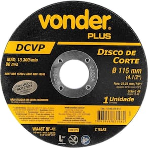Conteúdo da embalagem: 1 Disco de corte 115mm x 10mm x 2223mm DCVP Vonder Plus