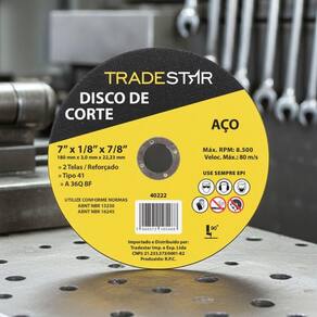 O Disco de Corte Tradestar Pro 230 x 3 mm Furo 7/8 Reforçado Aço é a solução ideal para quem busca um disco resistente, durável e eficiente em trabalhos de corte de metais ferrosos e não ferrosos. Produzido com óxido de alumínio aglomerado com resina, este disco abrasivo oferece alto desempenho e precisão em cortes de chapas, tubos, perfis e peças metálicas diversas, sendo especialmente indicado também para aço idável. Com diâmetro externo de 230 mm (4.1/2), espessura de 3,0 mm e furo central de 22,23 mm (7/8), o disco é compatível com esmerilhadeiras angulares de diferentes marcas. Sua espessura reforçada de 3 mm proporciona maior robustez e vida útil, garantindo cortes confiáveis em materiais mais espessos ou em operações que exigem maior resistência do acessório.