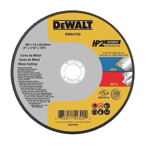Disco De Corte 180x1.9x22mm Aço/inox Dewalt Hp2 Dw84706 Disco de Corte 180X1.9X22mm Aço/Inox Dewalt HP2 DW84706 - Disco de Corte 180X1.9X22mm Aço/Inox Dewalt HP2 DW84706 Características Gerais do Produto: - Modelo: DW84706 - Marca: Dewalt - Furo: 22,23mm - Dimensões: 180X1.9X22mm - Diâmetro: 180mm - Ideal Para: Cortes em aço/inox. Garantia: - 03 meses de garantia direto com o fabricante
