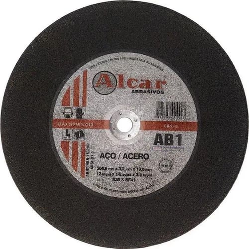 Disco de corte 304,8x3,2x25,4mm ab2 a30 s - alcar - Corte de aço e de materiais ferrosos Produto desenvolvido para o corte de perfis, barras e chapas Ideal para utilização em serralherias Possui duas telas de reforço Especificações técnicas Diâmetro do disco de corte: 304,8mm Espessura do disco de corte: 3,2mm Diâmetro do furo do disco de corte: 25,4mm Características gerais do produto: Tamanho: 10 x 15 x 15 300g : 3 meses Marca: Não Informado