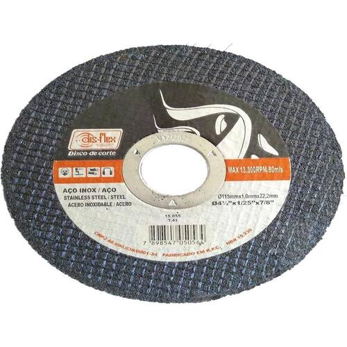 Disco de corte 115x1,0x22mm 4.1/2 x 1/25 x 7/8 Para Lixadeiras de Ø 4.1/2 Cortes de metal Pacote com 50 unidades Os Disco de Corte Dislfex são indicados para o corte de aço carbono e inox, com alto desempenho, baixa geração de calor e sem rebarbas. Os Discos tem como diferencial seu alto desempenho com baixo custo. Use os discos conforme norma ABNT 15230. Sempre verifique rotação de trabalho e posição de uso conforme indicação no rótulo do produto. Sempre use equipamento de proteção individual. Marca: Não Informado
