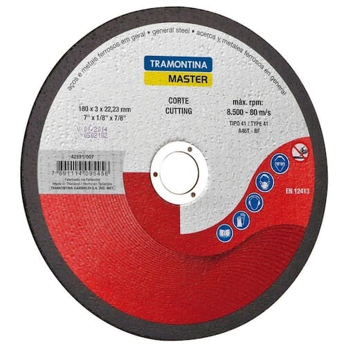 Disco De Corte 7" Tramontina Para Aços E Metais Tramontina Disco de corte 7 Tramontina para Aços e Metais Tramontina - Quem procura por qualidade e rendimento, vai encontrar no Disco de corte 7 polegadas Tramontina para Aços e Metais a escolha ideal. Fabricado para uma alta performance, o produto é ideal para ao corte em metais ferrosos e aços. Além disso, garante suavidade e precisão nas operações realizadas. Opte pela eficácia com peças Tramontina.OrientaçõesDisco produzido em óxido de alumínio; Corpo reforçado com 2 malhas de fibra de vidro; Anel interno de aço especial; Velocidade máxima de trabalho 80m/s - 13300 rpm; Modelo tipo 41 - A46T-BF EN12413 ABNT NBR 15230 Utilizado juntamente com esmerilhadeiras nos trabalhos de corte em aços e metais ferrosos em geral. Proporciona um excelente rendimento nas operações de corte; Todas as ferramentas são produzidas e testadas conforme normas específicas.ObservaçõesUse óculos, luvas de segurança, protetor auricular, máscara de proteção contra poeira e vestimentas adequadas de acordo com a tarefa a ser executada. Sempre manuseie e armazene os discos com cuidado. Antes da utilização, faça uma avaliação visual certificando-se que não haja danos ou trincas nos discos. Certifique-se que a velocidade do equipamento não exceda a velocidade máxima marcada nos discos. Utilize flanges de tamanho igual e modelo apropriado para cada tipo de disco. Sempre utilize o protetor de segurança do equipamento. Sempre que utilizar discos novos, antes da operação trabalhe com a máxima rotação, sem carga, por um minuto em área protegida. Tal procedimento tem o objetivo de verificar a integridade dos discos. Utilize apoio para os braços, se necessário. O ambiente de trabalho deve ser ventilado para evitar doenças respiratórias. Não utilize discos que foram expostos a umidade e temperaturas extremas. Não utilize discos que sofreram quedas ou que apresentem danos. No momento da montagem, não force os discos contra o equipamento ou altere o tamanho do furo central. Não aperte as flanges excessivamente. Não fique diretamente em frente aos discos durante a operação. Não utilize os discos para outros fins a não ser para os que foram projetados. Armazene em local limpo e seco.Características GeraisEAN137891114095456DUN1417891114095453NCM6804.22.11Peso Líquido0,1700 kg.Peso Bruto0,2000 kg.Metragem0,000097 m.Dimensões Embalagem (Compr. X Larg. X Alt.)180x 180x 3 mm.Dimensões Produto (Compr. X Larg. X Alt.)180x 180x 3 mm.Dimensão Extra A3,0 mm.Dimensão Extra B180,0 mm.Dimensão Extra C22,2 mm. Características Gerais do Produto: Garantia: - 1 Ano