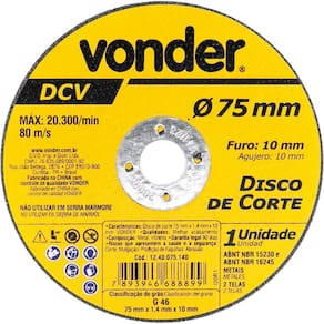 Marca: VonderConteúdo da Embalagem:1 Disco de corteDestaques e diferenciais:Proporciona cortes rápidos e menor geração de calor e rebarbasAplicações e dicas de uso:Indicado para corte de metais, inclusive aço inox. Utilizado em cortadores pneumáticos. Não utilizar em serra mármore.Características Técnicas:Diâmetro do disco de corte: 75 mm Espessura do disco de corte: 1,4 mm - +/- 1/16 Diâmetro do furo do disco de corte: 10 mm