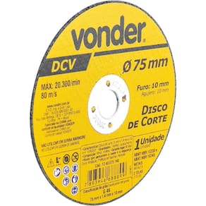 Marca: VonderConteúdo da Embalagem:1 Disco de corteDestaques e diferenciais:Proporciona cortes rápidos e menor geração de calor e rebarbasAplicações e dicas de uso:Indicado para corte de metais, inclusive aço inox. Utilizado em cortadores pneumáticos. Não utilizar em serra mármore.Características Técnicas:Diâmetro do disco de corte: 75 mm Espessura do disco de corte: 1,4 mm - +/- 1/16 Diâmetro do furo do disco de corte: 10 mm Marca: Não Informado Ean: 7893946688899