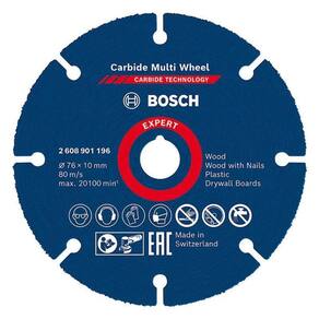 O disco de corte EXPERT Carbide Multi-wheel é capaz de executar cortes limpos e rápidos em diversos tipos de materiais com máxima segurança. Desenvolvido com tecnologia Carbide Technology da Bosch foi a primeira solução que possibilitou o corte de materiais macios com segurança durante a aplicação utilizando esmerilhadeiras. O disco é fabricado com carbeto de tungstênio metal duro por tecnologia de fusão à laser, trazendo alta durabilidade e possibilitando corte fácil e seguro nas diferentes aplicações. O disco de corte EXPERT Carbide Multi-wheel tem design com corpo fino e os canais de expansão garantem boa velocidade de corte e evitam a deformação da lâmina. São indicados para corte em madeira, madeira com pregos, madeira com resto de alvenaria, meteriais sintéticos, drywall, plástico, PVC, gesso e tubos de cobre e utilização esmerilhadeiras manuais. Garantia 6 meses Bosch.- Corte de diversos materiais com apenas um disco- Com a borda de metal duro fabricado com tecnologia de fusão a laser proporciona maior rendimento e maior vida útil do disco- O design com corpo fino e os canais de expansão garantem boa velocidade de corte e evitam a deformação da lâmina.- Durabilidade excepcional com a tecnologia Carbide da Bosch.Especificações técnicas:- Diâmetro do item mm : 76- Diâmetro do item polegadas : 3- Diâmetro do furo mm : 10- Diâmetro do furo polegadas : 3/8- Tipo: corte- Centro: reto- Rpm Máximo: 20.100 RPM- Corte de diversos materiais com apenas um disco- Com a borda de metal duro fabricado com tecnologia de fusão a laser proporciona maior rendimento e maior vida útil do disco- O design com corpo fino e os canais de expansão garantem boa velocidade de corte e evitam a deformação da lâmina.- Durabilidade excepcional com a tecnologia Carbide da Bosch.