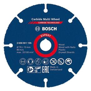 O disco de corte EXPERT Carbide Multi-wheel é capaz de executar cortes limpos e rápidos em diversos tipos de materiais com máxima segurança. Desenvolvido com tecnologia Carbide Technology da Bosch foi a primeira solução que possibilitou o corte de materiais macios com segurança durante a aplicação utilizando esmerilhadeiras. O disco é fabricado com carbeto de tungstênio metal duro por tecnologia de fusão à laser, trazendo alta durabilidade e possibilitando corte fácil e seguro nas diferentes aplicações. O disco de corte EXPERT Carbide Multi-wheel tem design com corpo fino e os canais de expansão garantem boa velocidade de corte e evitam a deformação da lâmina. São indicados para corte em madeira, madeira com pregos, madeira com resto de alvenaria, meteriais sintéticos, drywall, plástico, PVC, gesso e tubos de cobre e utilização esmerilhadeiras manuais. 6 meses Bosch. - Corte de diversos materiais com apenas um disco - Com a borda de metal duro fabricado com tecnologia de fusão a laser proporciona maior rendimento e maior vida útil do disco - O design com corpo fino e os canais de expansão garantem boa velocidade de corte e evitam a deformação da lâmina. - Durabilidade excepcional com a tecnologia Carbide da Bosch. Especificações técnicas: - Diâmetro do item mm : 76 - Diâmetro do item polegadas : 3 - Diâmetro do furo mm : 10 - Diâmetro do furo polegadas : 3/8 - Tipo: corte - Centro: reto - Rpm Máximo: 20.100 RPM - Corte de diversos materiais com apenas um disco - Com a borda de metal duro fabricado com tecnologia de fusão a laser proporciona maior rendimento e maior vida útil do disco - O design com corpo fino e os canais de expansão garantem boa velocidade de corte e evitam a deformação da lâmina. - Durabilidade excepcional com a tecnologia Carbide da Bosch. Marca: Não Informado