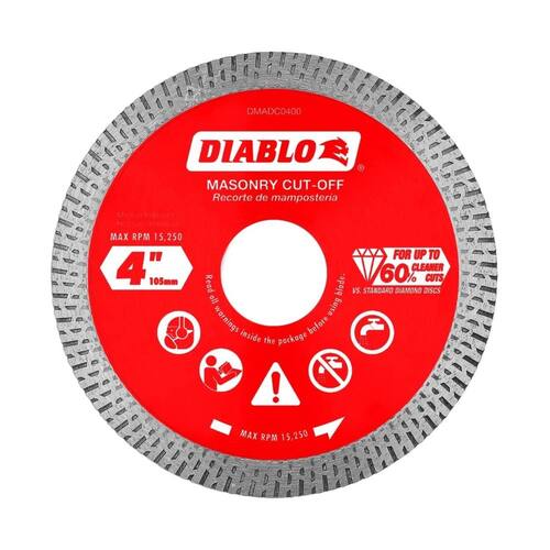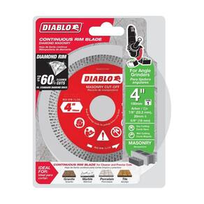 Diablo's diamond continuous rim masonry cut-off discs provide cleaner and precise cuts in granite, marble, porcelain and tile. These diamond rimmed discs deliver up to 60% smoother cuts versus standard diamond cut-off discs. The disc's industrial-grade diamonds with hardened disc body delivers lasting durability and maximizes cutting quality in hardened materials even in extreme applications.