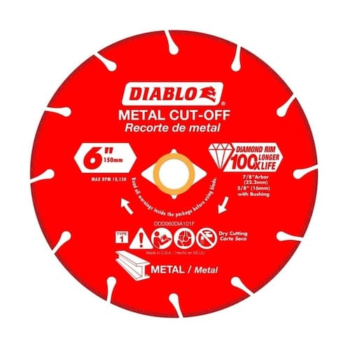 Disco de corte Diablo Diamond Metal para lixar e polir metal - Segmentado, mandril de 5/8" e 7/8", 6" de diâmetro, 10150 RPM máximos - DDD060DIA101F - Vida útil de corte de