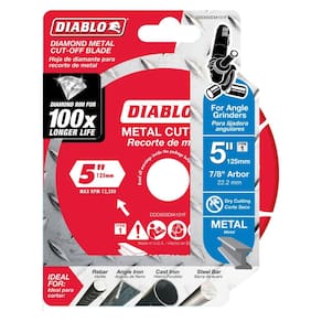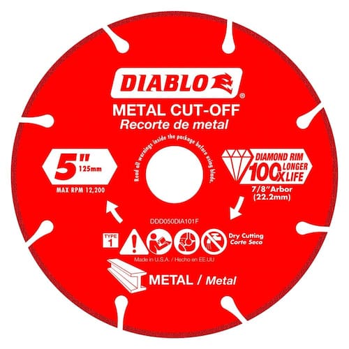 The Diablo Diamond Metal Cut-Off Disc is built for extreme durability and performance, delivering up to 100X longer cutting life compared to standard bonded discs. This 5" segmented disc is engineered for intense metal-cutting applications, such as cutting rebar, angle iron, cast iron, and steel bars. Featuring advanced diamond technology, this disc offers superior safety by reducing sparks, dust, and the risk of shattering, while maintaining its cutting diameter for consistent, accurate results throughout its long life. The disc�s electro-plated diamond edge ensures an even distribution of abrasive material, delivering smooth, efficient cuts with minimal downtime. Ideal for professionals seeking durability, safety, and maximum productivity in metal cutting.
