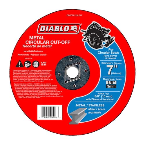 Maximize your cutting efficiency with the Diablo 7" Metal Cut-Off Disc. This disc is engineered for superior performance in medium-duty metal cutting tasks, featuring a premium aluminum oxide blend for faster material removal and an extended cutting life. Fully reinforced for Hand-held cut-off work, it is ideal for cutting steel, stainless steel, cast iron, and sheet metal. Designed for use with any corded or cordless 7-1/4" circular saw, this disc supports a maximum RPM of 8,450, ensuring efficient and effective performance across multiple metal cutting projects. Whether you're cutting angle iron, metal slotting, cutting steel studs, or fabricating sheet metal, the Diablo metal cut-off disc is your reliable choice for professional-grade results. Each pack contains one 7" cut-off disc with a 5/8" DKO arbor, perfectly suited for medium-duty cutting applications.