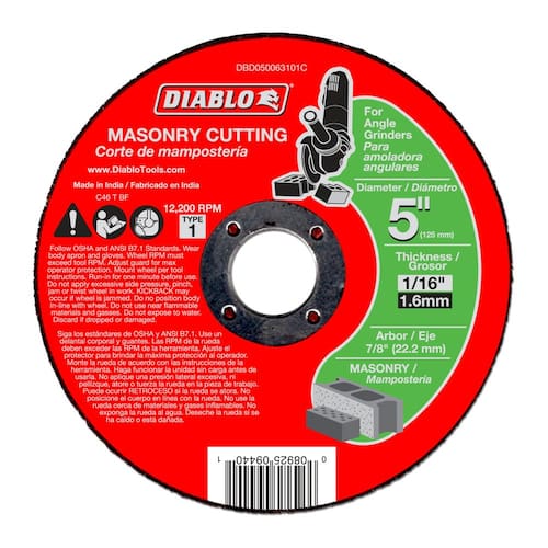 Elevate your masonry cutting projects with the Diablo 5" Masonry Cut-Off Disc. Delivering superior performance and productivity, this disc is engineered with a premium silicon carbide blend designed to cut through masonry materials quickly while offering an extended cutting life. The Type 1 flat disc design ensures precise, straight-on cuts, while its full reinforcement provides safety and durability during hand-held use. Ideal for cutting concrete brick, cinder block, cement, and paver stones, this disc is optimized for use with 5" angle grinders, supporting a maximum RPM of 12,200. Whether you're cutting masonry for construction or slotting masonry, the Diablo masonry cut-off disc is your dependable tool for professional-grade results. Each pack contains one 5" cut-off disc with a 7/8" arbor, perfectly suited for medium-duty cutting applications.