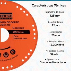 Características Técnicas Diâmetro do disco: 125 mm Diâmetro do furo: 22 mm Anel redutor: 20 mm Tipo de corte: Contínuo diamantado Rotação máxima: 12.200 RPM Velocidade máxima: 80 m/s Equipamento compatível: Esmerilhadeira angular (125 mm) Código Interno: 8271224 Marca: Starfer