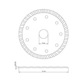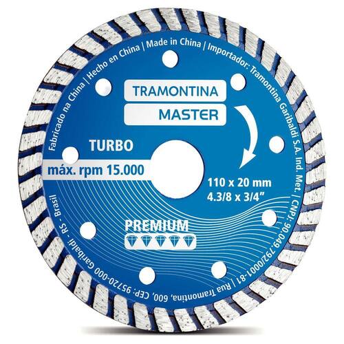 Se você é um profissional que se preocupa com o desempenho do seu trabalho, o Disco de Corte Diamantado 4.3/8 polegadas Tramontina Premium foi fabricado para atender às suas expectativas. Com a qualidade da marca em serviço do rendimento e da alta performance, a ferramenta é ideal no corte de telhas, granito, mármore, basalto, entre outros. Tenha a Tramontina como companheira em sua atividade. Orientações Corpo em aço liga especial; -Têmpera total no corpo;Dureza diferenciada na área de corte;Velocidade máxima de trabalho 80m/s - 15000 rpm;42 dentesCom anel de redução (20-16mm);Utilizados juntamente com serras mármores nos trabalhos de corte em granitos, mármores, telhas, telhas de fibrocimento, basalto e outros materiais que não necessitam de um acabamento liso, mas que também não podem lascar ou apresentar rebarbas.Podem ser utilizados em cortes à seco sem riscos de superaquecimento. Porém, sempre que possível utilize refrigeração para elevar o rendimento do corte e a vida útil do disco. Todas as ferramentas são produzidas e testadas conforme normas específicas. Características Gerais EAN13 7891114102482 DUN14 17891114102489 NCM 6804.21.19 Peso Líquido 0,0900 kg. Peso Bruto 0,1200 kg. Metragem 0,000131 m³. Dimensões Embalagem (Compr. X Larg. X Alt.) 175x 150x 5 mm. Dimensões Produto (Compr. X Larg. X Alt.) 110x 110x 2 mm. Dimensão Extra A 2,0 mm. Dimensão Extra B 110,0 mm. Dimensão Extra C 20,0 mm. Observações Use óculos, luvas de segurança, protetor auricular, máscara de proteção contra poeira e vestimentas adequadas.Manuseie e armazene os discos com cuidado.Antes da utilização, faça uma avaliação visual certificando-se para que não haja danos ou trincas nos discos.Certifique-se que a velocidade do equipamento não exceda a velocidade máxima marcada nos discos.Utilize flanges de tamanho igual e modelo apropriado para cada tipo de disco.Sempre utilize o protetor de segurança do equipamento.Sempre que utilizar discos novos, antes da operação trabalhe com a máxima rotação, sem carga, por um minuto em área protegida. Tal procedimento tem o objetivo de verificar a integridade dos discos.O ambiente de trabalho deve ser ventilado para evitar doenças respiratórias.Não utilize discos que sofreram quedas ou que apresentem danos.No momento da montagem, não force os discos contra o equipamento ou altere o tamanho do furo central.Não aperte os flanges excessivamente.Não fique diretamente em frente aos discos durante a operação.Não utilize os discos para outros fins a não ser para os que foram projetados.Faça apenas cortes retos.Verifique o sentido de rotação ao instalar o disco.Não utilizar em metais ou madeiras.Armazene em local limpo e seco.