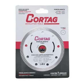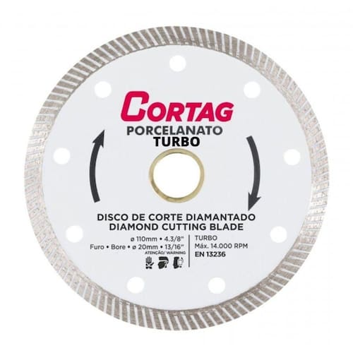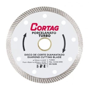 Disco De Corte Diamantado Cortag Porcelanato Turbo 110mm Código: âmetro do disco: 110mmDiâmetro do furo: 20mmBucha de redução: 16mmPeso: 120g A imagem do produto é ilustrativa e pode variar de tonalidade e cor de acordo com a configuração de cada objetos que compõem a foto ambientada não acompanham o meramente ilustrativas.