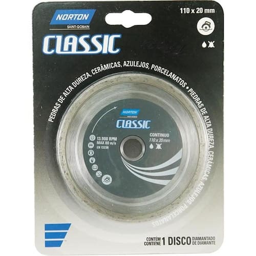 Disco de corte diamantado liso Norton Classic 110mm Indicado para operações simples do dia a dia, o disco diamantado Classic contínuo é ideal para corte de pedras de alta dureza, cerâmicas, azulejos e porcelanatos. Combinação duração/rendimento permite cortar sem problema Características Técnicas: Contínuo Corte a úmido ou seco Diâmetro externo: 110mm Diâmetro do furo: 20mm RPM: 13900 Marca: Norton