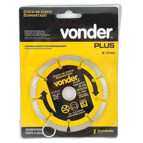 Disco De Corte Diamantado Segmentado Seco Plus 110mm - Vonder O disco de corte diamantado plus vonder proporciona qualidade e produtividade na operação. Informações técnicas: - Modelo: NL - Perfil do corte: Segmentado - Tipo de corte do disco de corte diamantado: A seco - Diâmetro externo do disco de corte diamantado: 110 mm - Diâmetro do furo do disco de corte diamantado: 20,0 mm - Altura do segmento diamantado: 7 mm - Espessura do segmento diamantado: 1,8 mm - Rotação máxima: 14.000/min - Massa aproximada peso : 0.115 kg - Segue norma: ABNT NBR 15545 - : 90 dias Instruções: - Indicado para cortar mármore, granito, tijolo, concreto, entre outros. - Utilizado na construção civil para abertura de canaletas em paredes de alvenaria. - Os discos de corte a seco, quando refrigerados, proporcionam melhor rendimento. Conteúdo da embalagem: - 1 Disco de corte diamantado plus 110mm - 1 Bucha de redução de 20 mm para 16 mm Ean: 7893946054526